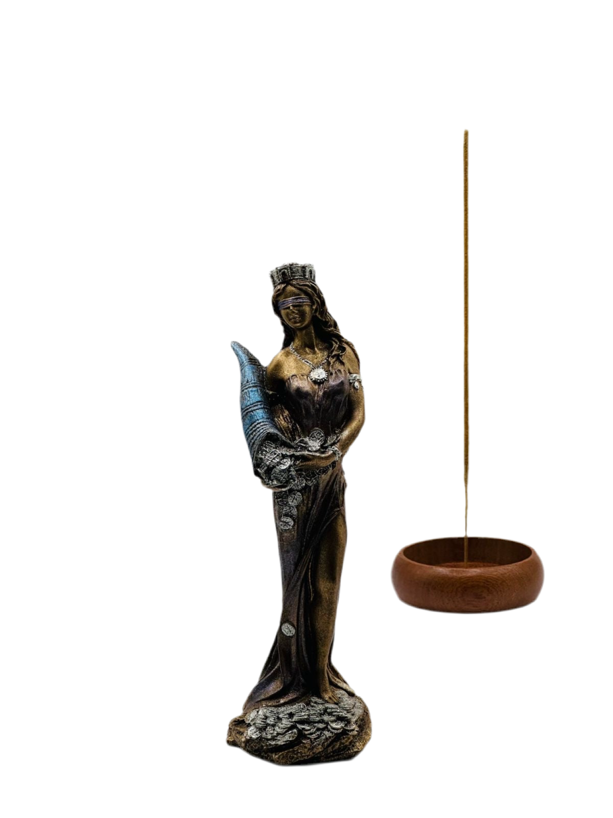 Pieza elegante que simboliza la prosperidad, la abundancia y la buena fortuna. Esta figura muestra la diosa de la fortuna sosteniendo un cuerdo rebosante de monedas, representando riqueza y prosperidad en todos los aspectos de la vida.