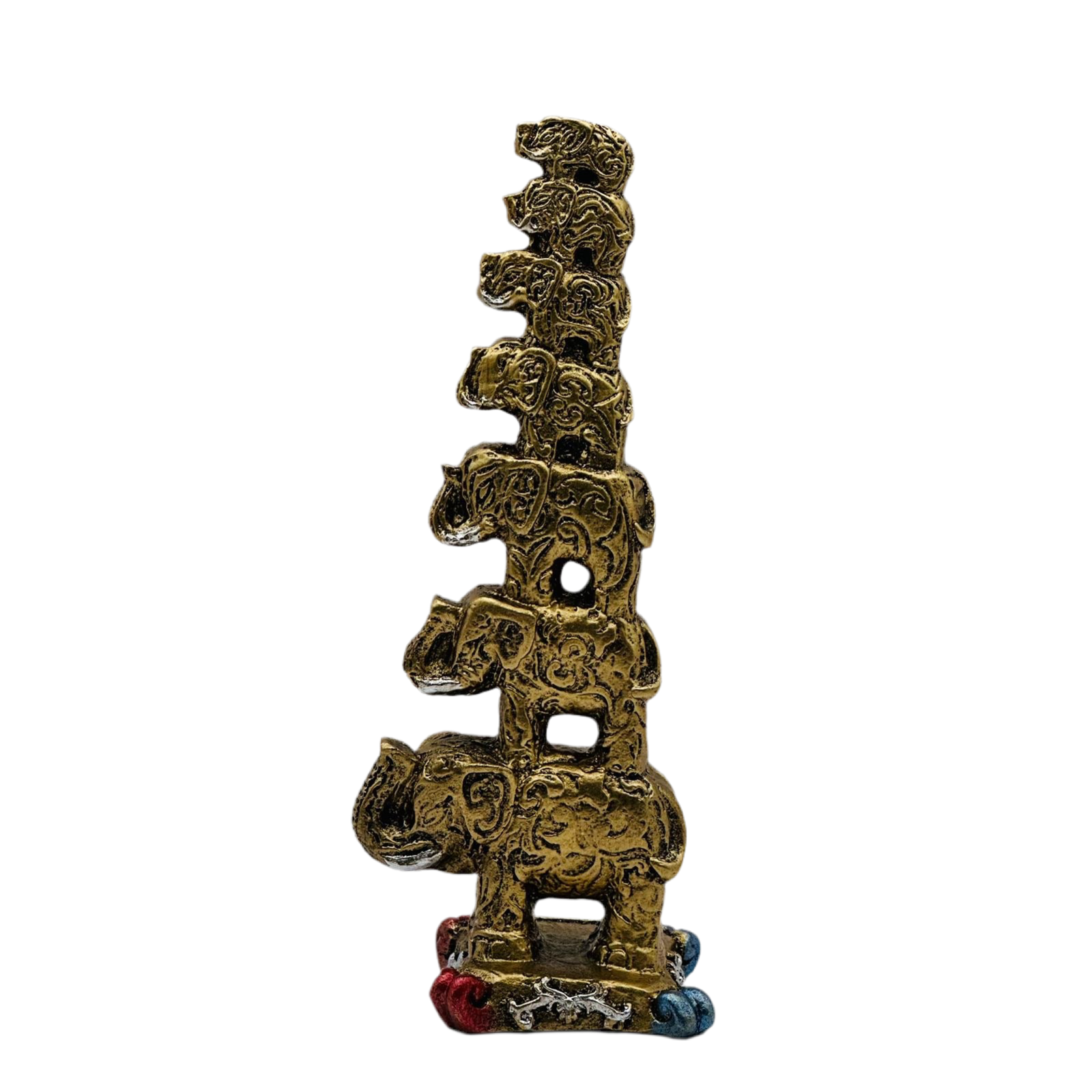 Los elefantes en pirámide son un símbolo de prosperidad, fuerza y buena fortuna. Nuestra pirámide en acabado dorado es ideales para decorar espacios, aportando un toque exótico y elegante a cualquier ambiente, atrayendo energía positiva y equilibrio.
